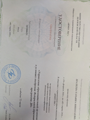 Шалеева Т.Н., заведующий нашего детского сада завершила курсы повышения квалификации «Управление образовательной организацией в условиях внедрения Федеральной образовательной программы ДО» в объеме 72 академических часов, срок обучения: с «16» 02 2026 года по «02» 03 2026 года.